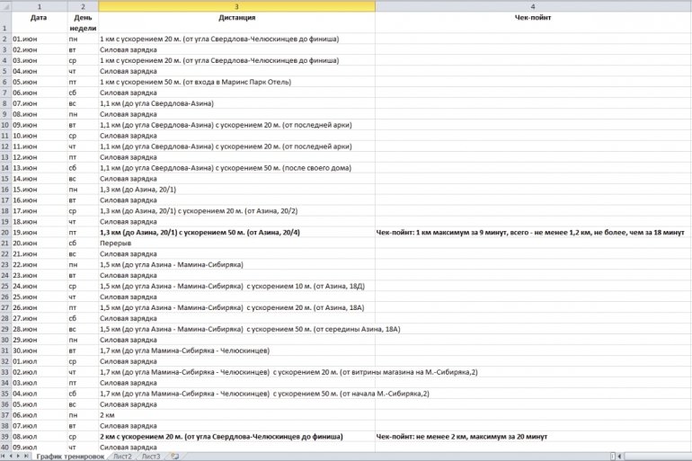 упить кроссовки, составить график тренировок (дата, время, дистанция)