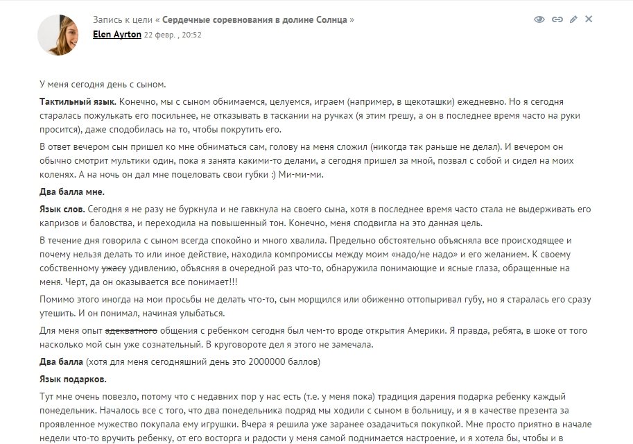 Дневник с проставлением галочек завела здесь для того, чтобы получать пинки от единомышленников, обмениваться опытом, делиться находками; отслеживать прогресс/регресс; фиксировать успехи; планировать деятельность на будущее.