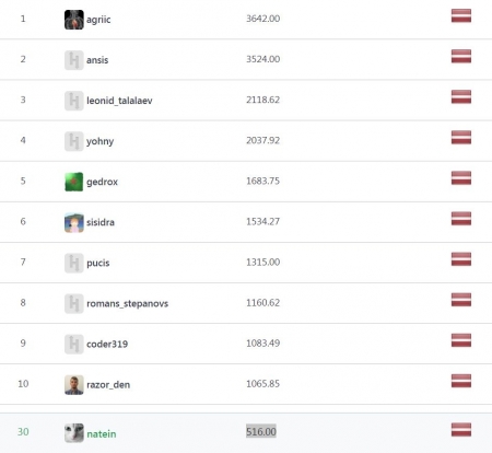 Цель Code Kata Anyway Anyday приучила меня решать небольшие задачки на регулярной основе. У меня появилось желание войти в тройку сильнейших по Латвии (пока только в режиме практика, а не в соревнованиях). Но даже это сделать весьма не просто, ведь чтобы попасть в тройку, нужно набрать 2118 баллов. И надо учесть, что они наверняка тоже решают задачи и увеличивают свои результаты.