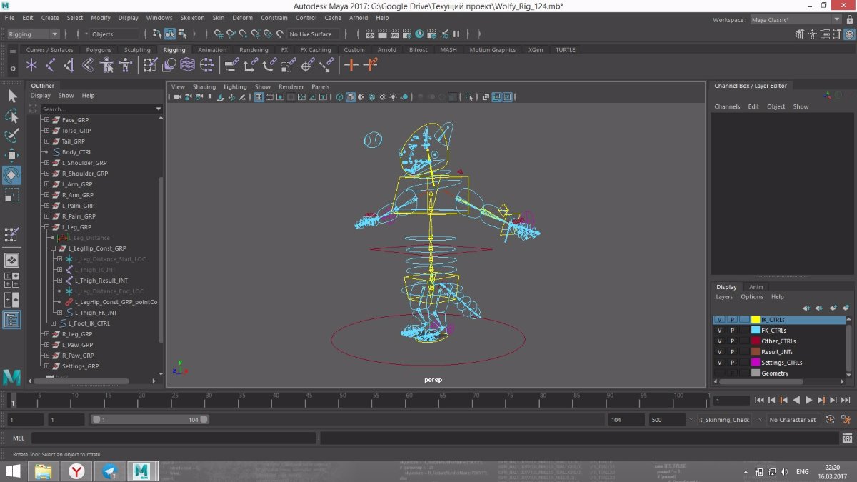 - Создание базового скелета с инверсной кинематикой, а так же контролеров и параметров для всего этого дела.