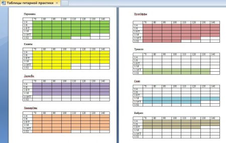 Сейчас я решил развить эту идею, и создал таблицы с темпами и длительностями, которые я должен заполнить за этот год. Делать буду так: выбираю способ игры (переменка, хаммеры, свип и тд), задаю темп, выбираю длительности и играю под метр в рипере. Если сыграл, например 10 тактов ровно, без плавания и спешки, то клетку в таблице зачёркиваю.