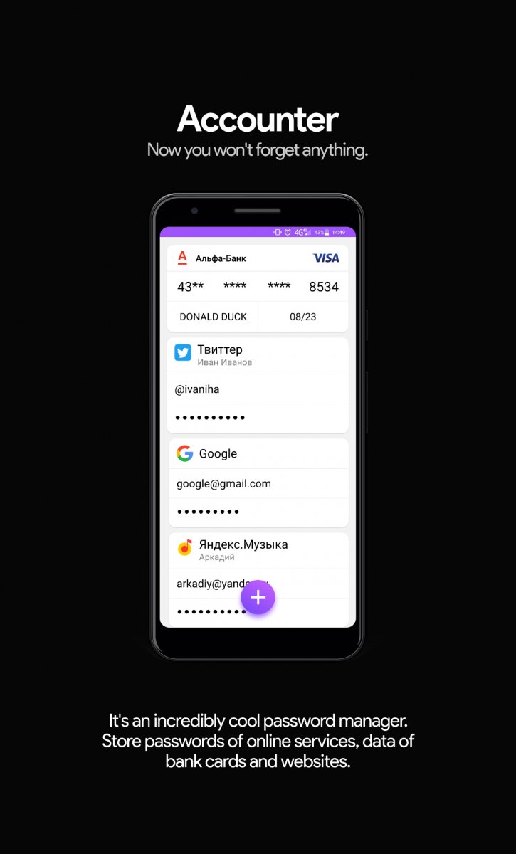 Аккаунтер - это приложение, которое в доступной форме позволяет легко заносить и надежно хранить логины/пароли и прочую информацию в одном месте. Основная суть Аккаунтера - его человечность. Денег на рекламу и продвижение совсем нет, поэтому выбрана стратегия максимально лучшего продукта на рынке, а также формирование образа "живого" приложения.