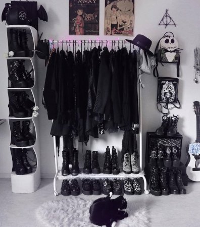 Тут сложнее - мне необходимо каким-то невероятным образом избавиться от шкафа (если он вдруг кому-то он понадобится - дайте знать), составить сочный готичный гардероб и красиво всё разместить.