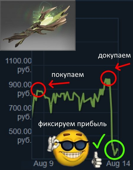 На фоне Battle Pass в Доте 2, рынок начнёт падать. Самое время подкупить некоторые вещи и ждать летней распродаже 25 июня и затем докупим уже на оставшиеся деньги вещи. Затем будем ждать роста цен. С такой тактикой цели я точно не достигну, но в минус точно не уйду да и для первого опыта отличный вариант.