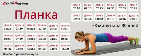 Сначала хочу по нарастающей поднять результат в планке до 5 минут за 30 дней.